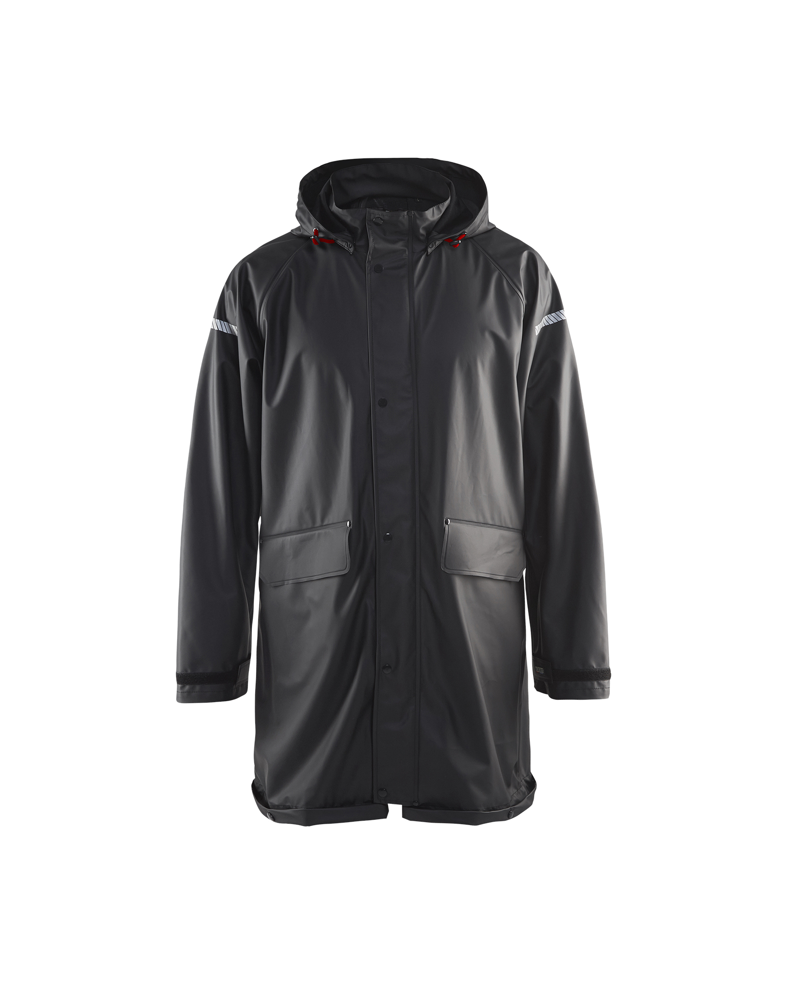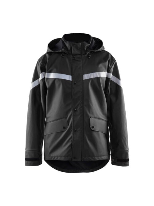 Eine Regenjacke für all jene mit Arbeitsaufgaben, die leichte und sanfte Regenkleidung erfordern. Sie ist wind- und wasserdicht und hat veschweisste Nähte, sowie eine abnehmbare und verstellbare Kapuze. Die Jacke hat eine Tropfkante am Bund mit einem Ablauf am Rücken und ist mit leicht zugänglichen Vordertaschen (eine mit D-Ring) versehen. Der Frontverschluss hat einen verdeckten Zwei-Wege Reissverschluss, der bis zum Sturmknopf am Kragen reicht und verstellbare Ärmel mit Klettverschluss. Die Jacke hat Reflexstreifen am Ärmel und am Rücken. Sie ist zertifiziert nach EN 343, Schutzkleidung vor schlechtem Wetter. Die Farben 4600 und 9900 wurden aktualisiert. Das alte Modell wird solange der Vorrat reicht, ausgeliefert.