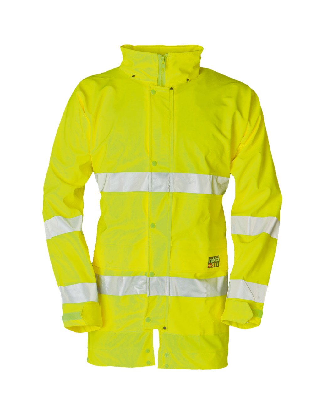 R-Flex Jacke. Zertifiziert nach EN ISO 20471 Kl. 3. Bi-Elast PU/PES 100% wasser- und winddicht (10’000) 2 Aussentaschen, Regenrinne am Saum, Kapuze am Kragen.